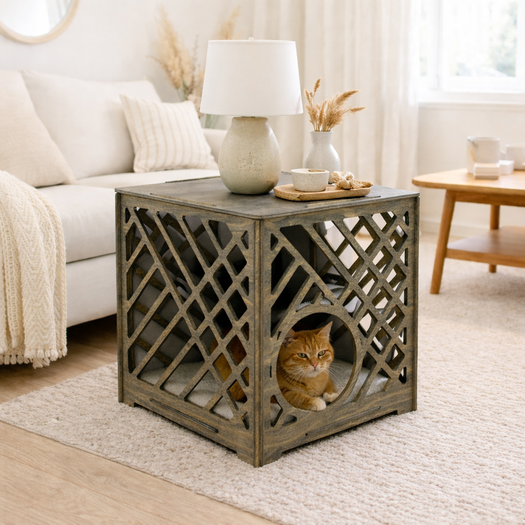 Интерьерный домик для кошки — это аккуратное и продуманное пространство, в котором питомцу будет спокойно и комфортно отдыхать. Компактная модель размером 50×50×50 см с паттерном «Линии» смотрится современно и легко вписывается в интерьер — от уютной классики до лаконичного минимализма.