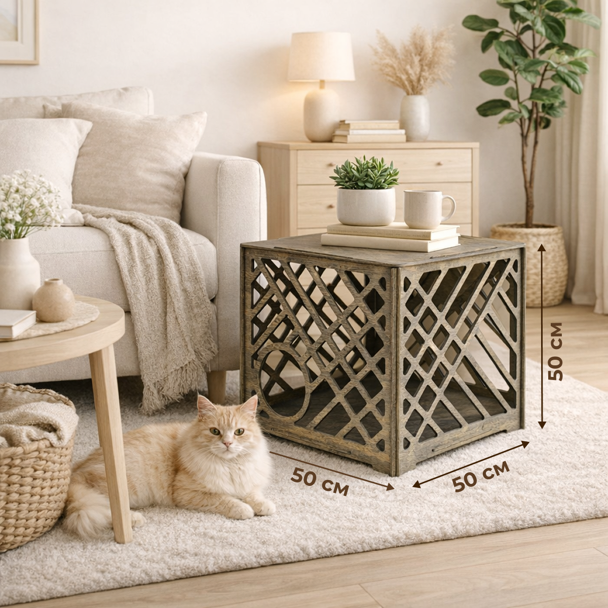 Паттерн «Линии» придаёт конструкции лёгкость и визуальную динамику, заменяя привычные решётки. Благодаря этому домик воспринимается как стильный элемент интерьера, а не как обычный аксессуар для животных.