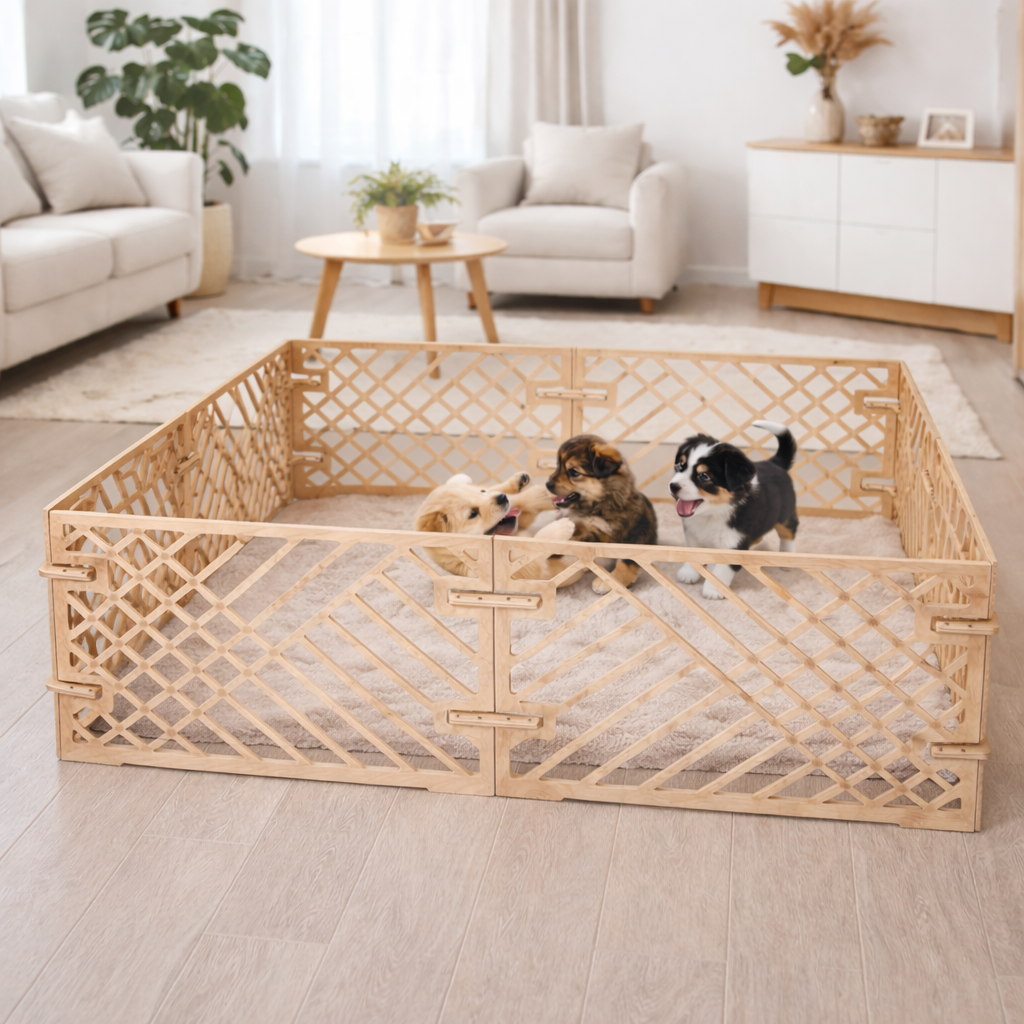 Манеж подойдет для щенков мелких и средних пород, а также может использоваться как временная зона для отдыха, игр и адаптации питомца в доме. Конструкция выглядит аккуратно и не воспринимается как клетка — это именно интерьерный вариант, который гармонично вписывается в жилое пространство.