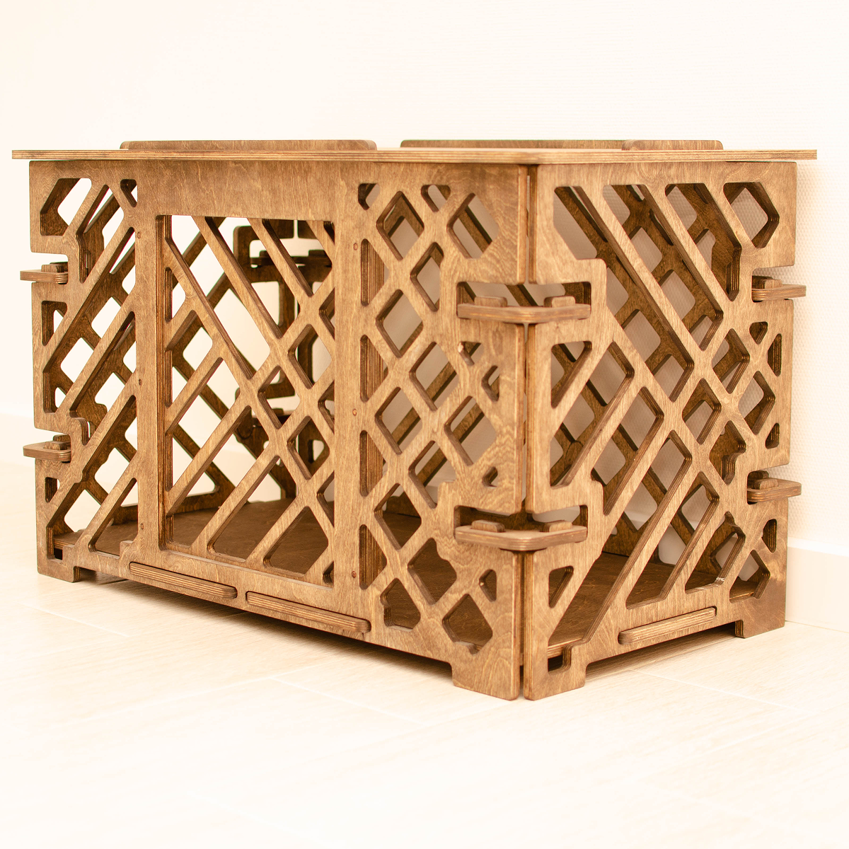 Интерьерный вольер-домик для собак и кошек размером 70×40×50 см выполнен из фанеры и покрыт колерованным маслом в цвете шоколад. Паттерн «Линии» делает конструкцию визуально лёгкой и позволяет использовать вольер как элемент мебели, подходящий для современного интерьера дома или квартиры.