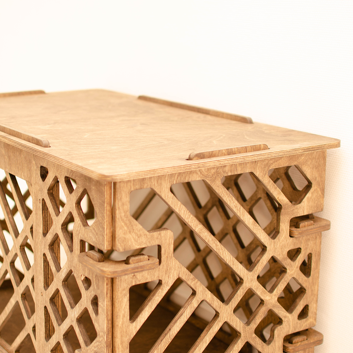 Покрытие колерованным маслом в цвете шоколад придаёт изделию тёплый, благородный оттенок и подчёркивает натуральную текстуру фанеры. Поверхность защищена от повседневных нагрузок и легко подходит для использования в квартире или доме.