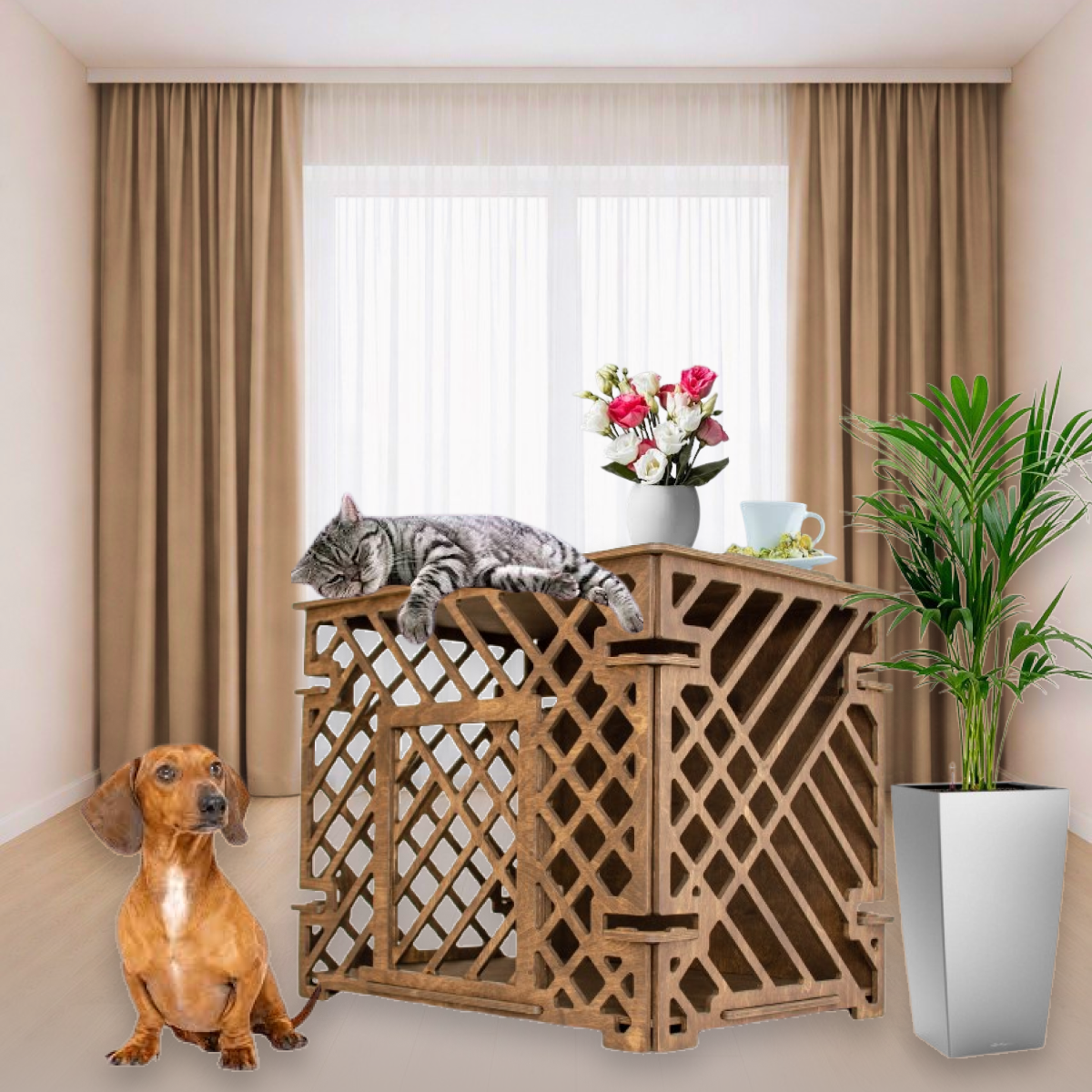 Этот интерьерный вольер подойдёт тем, кто ценит стиль, функциональность и комфорт питомца, не жертвуя эстетикой пространства.