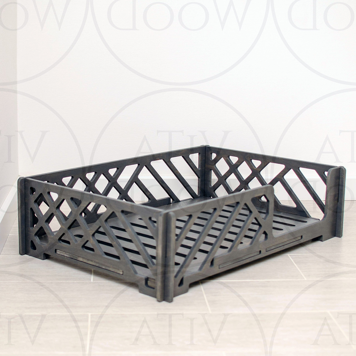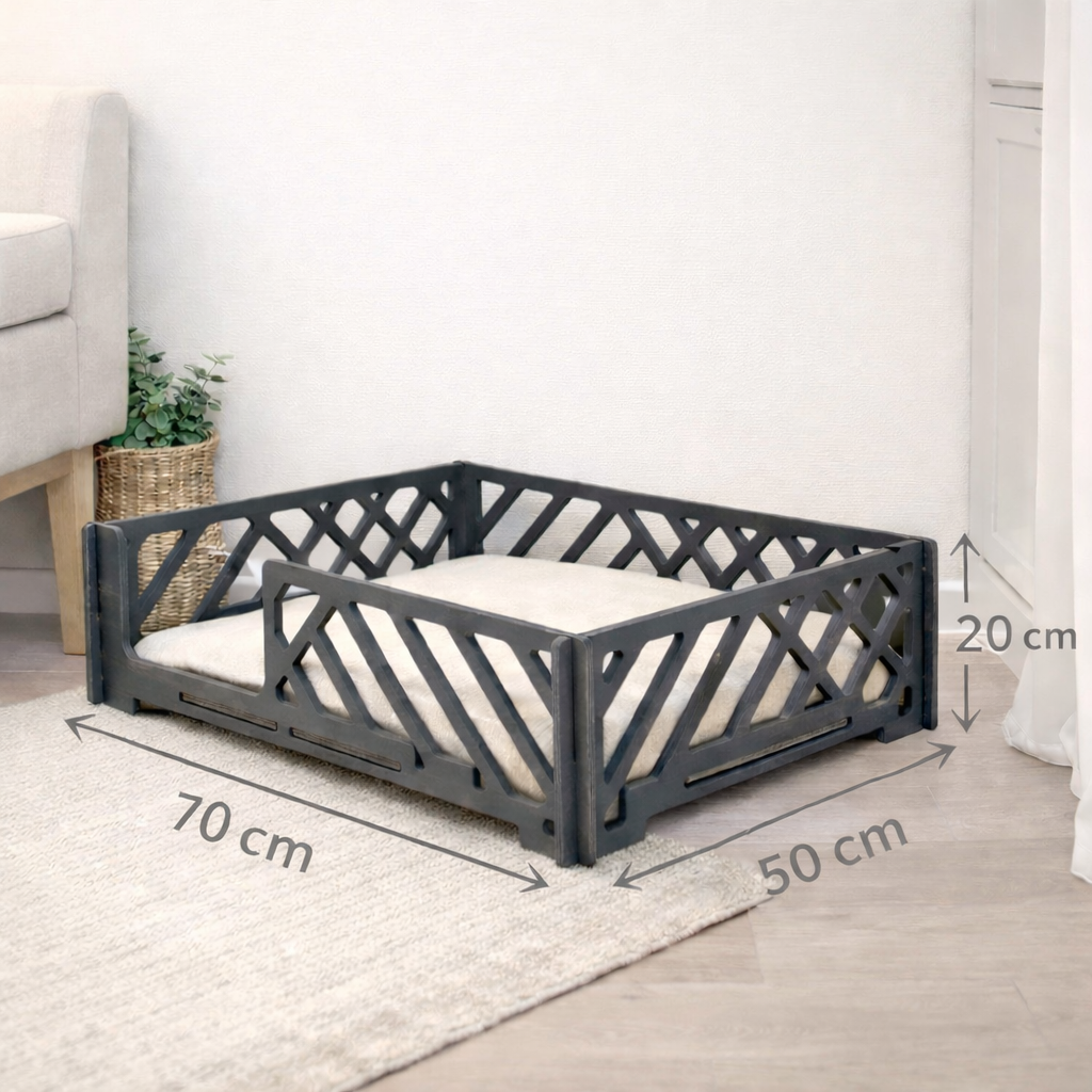 Основание выполнено из фанеры толщиной 10 мм и покрыто колерованным маслом в цвете графит. Покрытие защищает поверхность, делает изделие более практичным в использовании и придаёт лежанке глубокий, стильный оттенок.