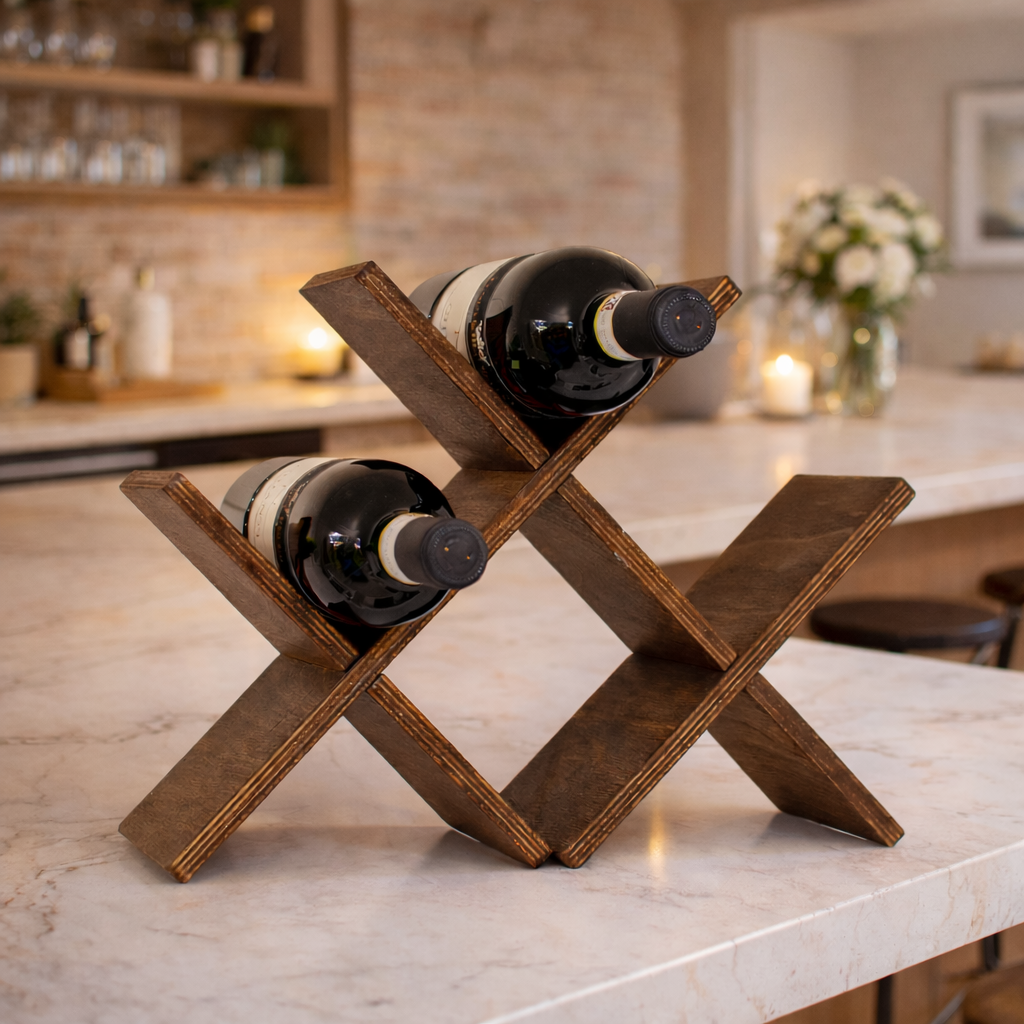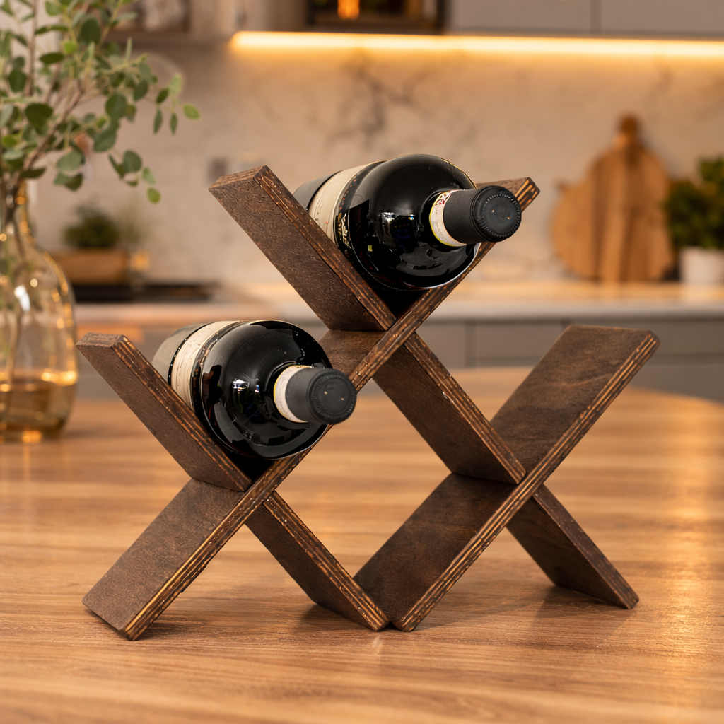 Компактная и стильная подставка для вина, созданная для аккуратного и правильного хранения бутылок. Изготовлена из натуральной фанеры, тщательно отшлифована и покрыта колерованным маслом, которое подчёркивает природную текстуру дерева и защищает поверхность от влаги и загрязнений. Подставка рассчитана на 4 бутылки вина и обеспечивает их горизонтальное хранение, сохраняя качество напитка и удобный доступ к каждой бутылке. Благодаря лаконичному дизайну изделие легко вписывается в интерьер кухни, гостиной, барной зоны или станет аккуратным винным акцентом на столе или полке.