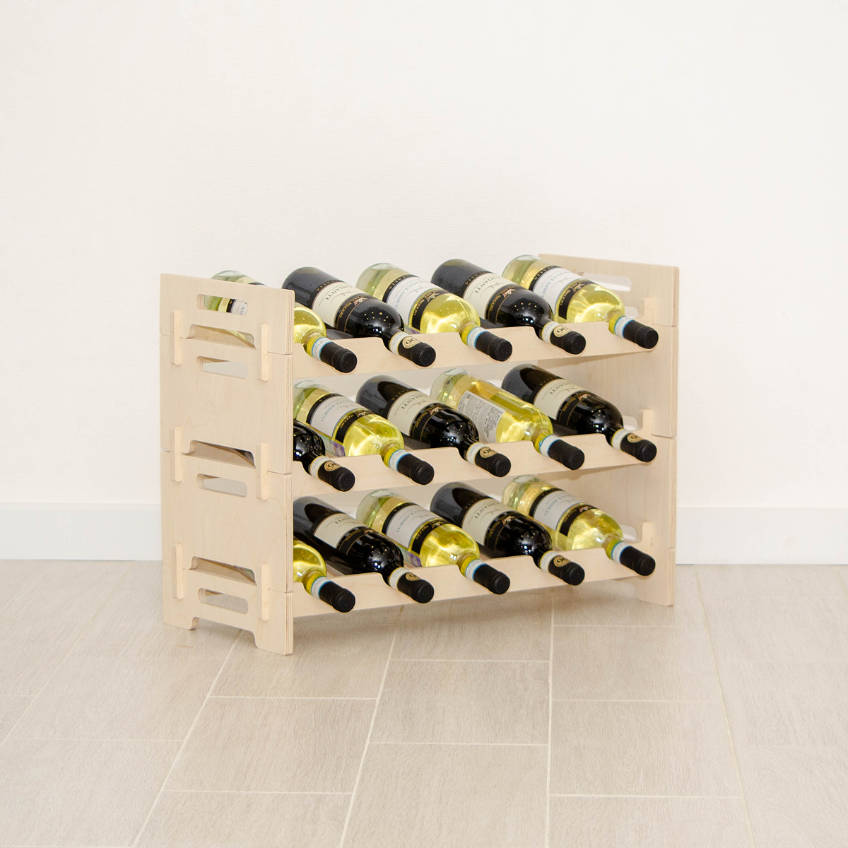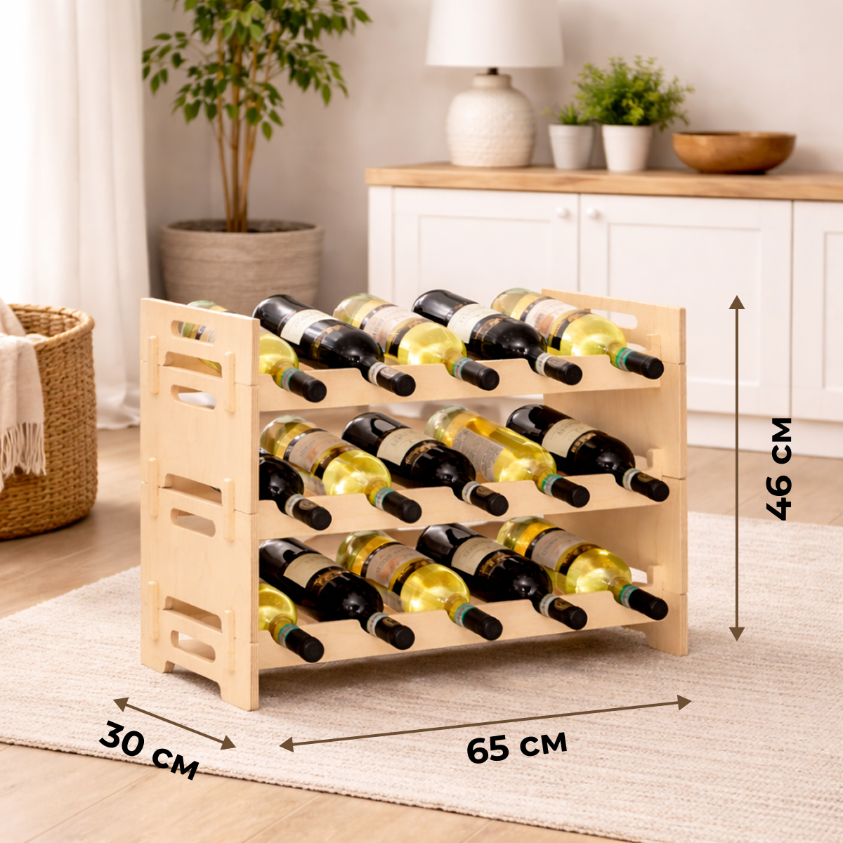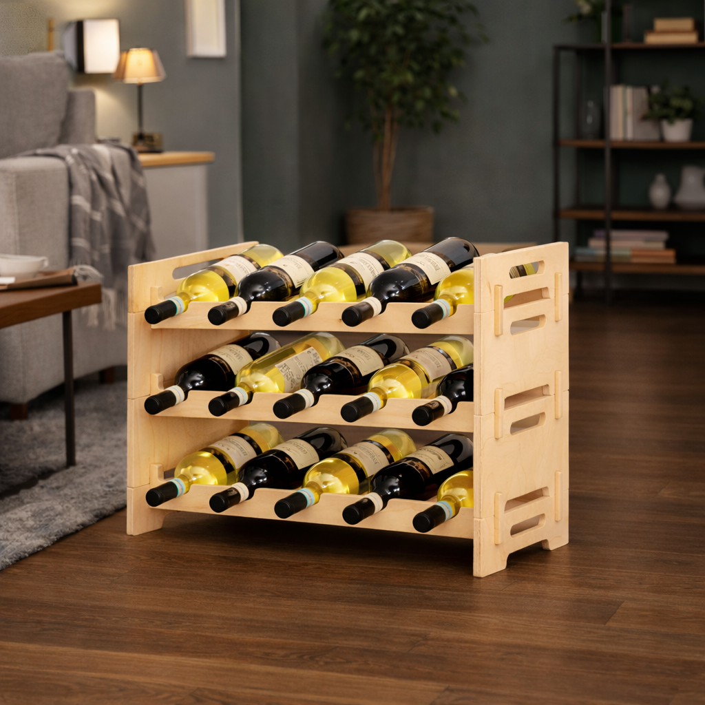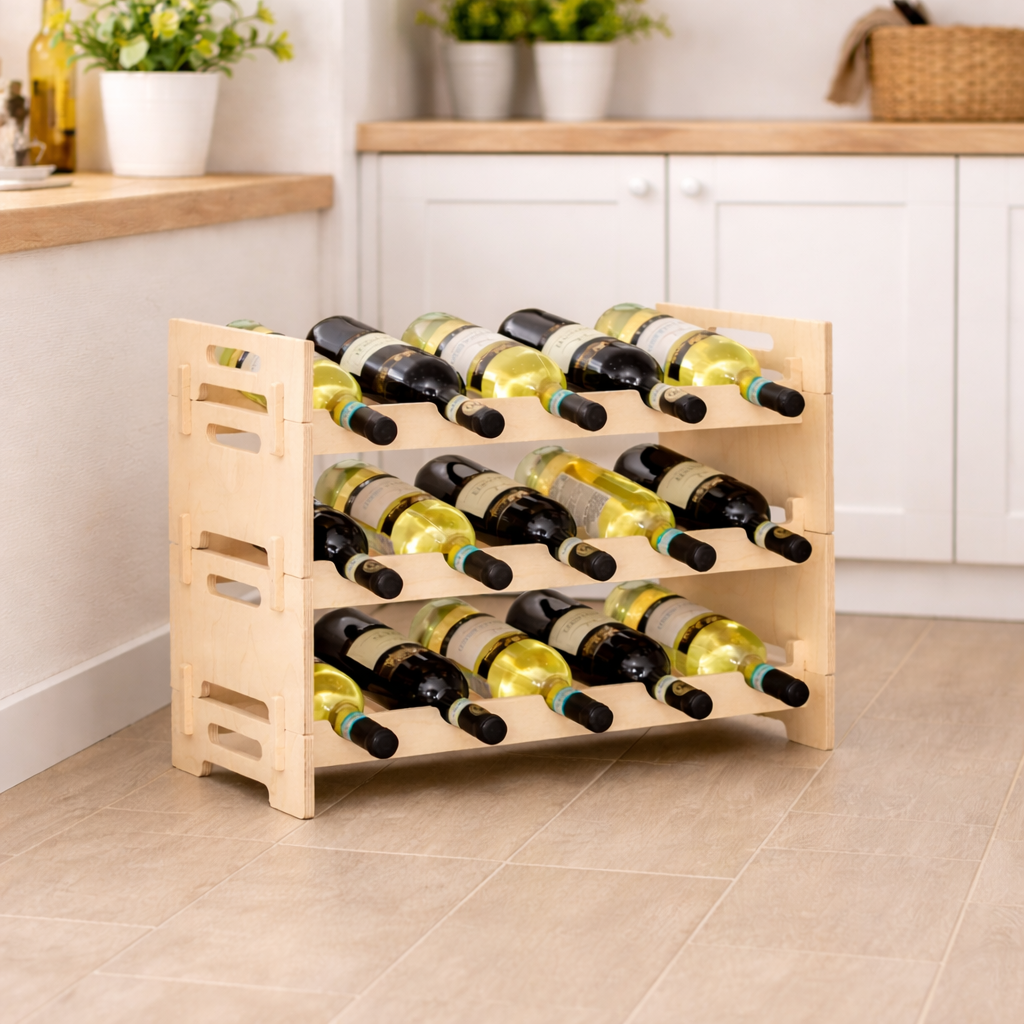 Стеллаж выполнен из отшлифованной фанеры без покрытия, благодаря чему сохраняется естественный цвет и текстура дерева. Такой стеллаж идеально вписывается в интерьер в стиле эко, минимализм или сканди, создавая аккуратный винный уголок и визуально лёгкое решение для хранения бутылок.