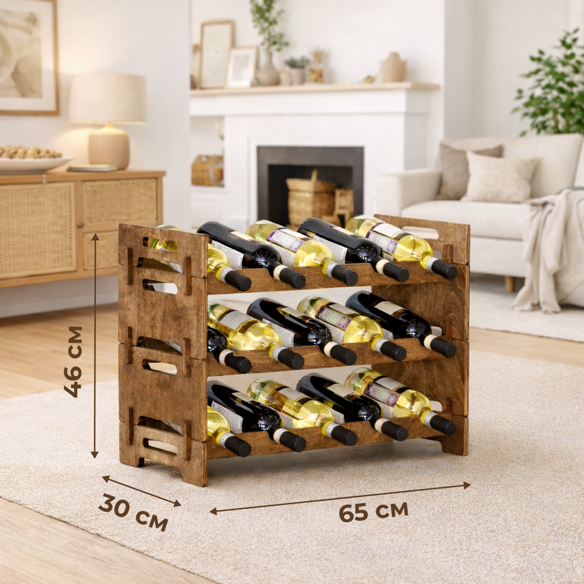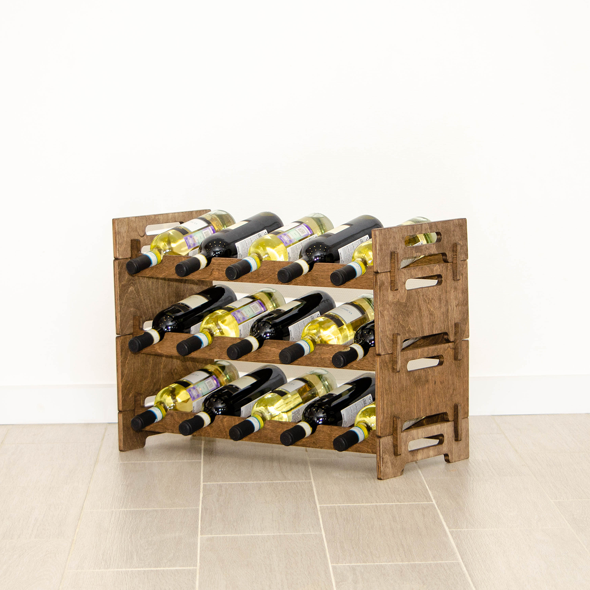 Элегантный винный стеллаж, созданный для аккуратного и безопасного хранения домашней коллекции вина. Стеллаж рассчитан на 15 бутылок вина и шампанского и станет практичным элементом интерьера кухни, гостиной или барной зоны.