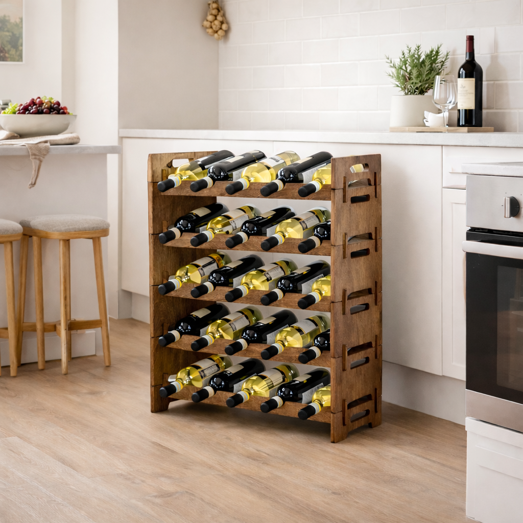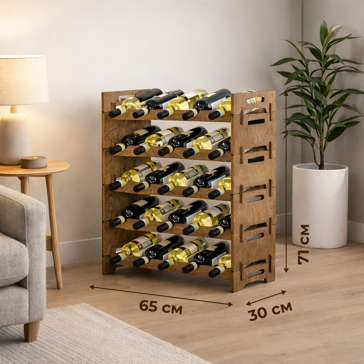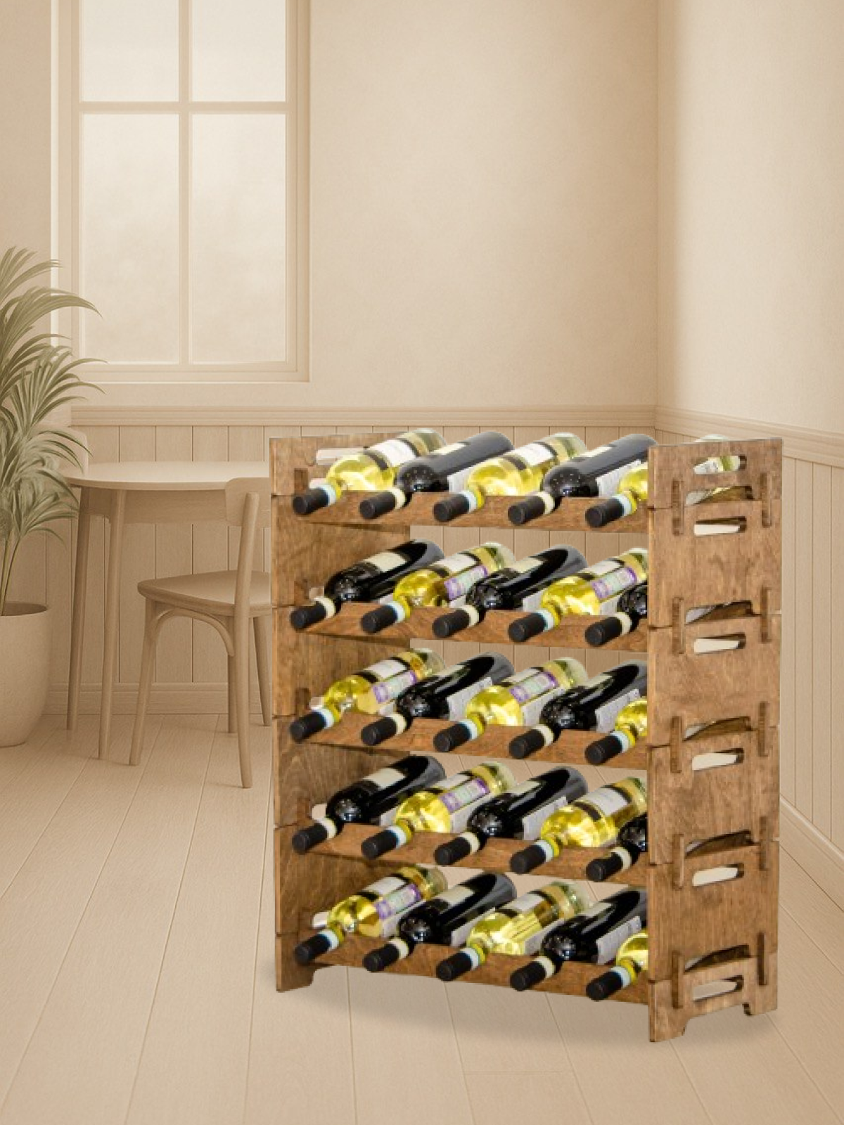 Вместительный винный стеллаж, созданный для организованного и правильного хранения коллекции бутылок. Он подойдёт тем, кто ценит порядок, эстетику и соблюдение условий хранения вина. Стеллаж рассчитан на 25 бутылок вина и шампанского и выполнен таким образом, что бутылки располагаются под небольшим наклоном. Это обеспечивает постоянное смачивание пробки вином, предотвращая её пересыхание и помогая сохранить вкус и качество напитка при хранении. Изделие изготовлено из натуральной фанеры, тщательно отшлифовано и покрыто колерованным маслом. Покрытие подчёркивает природную текстуру дерева и защищает поверхность от влаги и повседневных загрязнений. Продуманная конструкция обеспечивает устойчивость стеллажа даже при полной загрузке, а лаконичный дизайн гармонично вписывается в интерьер кухни, гостиной, барной зоны или погреба.
