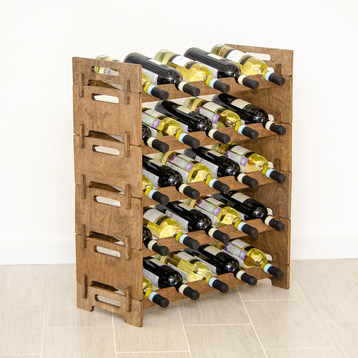 Деревянный стеллаж для хранения вина на 25 бутылок изготовлен из натуральной фанеры и покрыт колерованным маслом. Винный стеллаж подходит для хранения вина и шампанского дома, в квартире, на кухне, в гостиной или барной зоне и обеспечивает правильное горизонтальное положение бутылок.