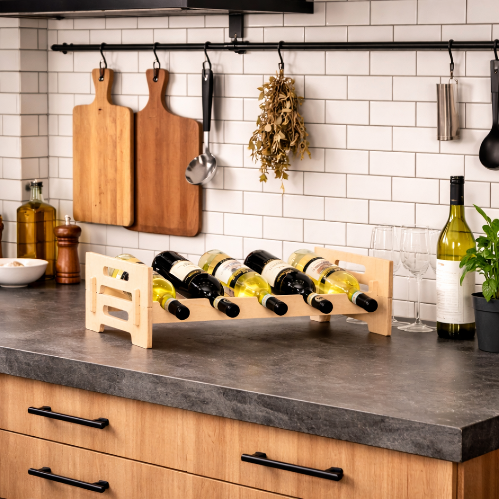 Лёгкий и компактный формат делает этот стеллаж удобным решением для кухни, открытых полок или небольшой винной зоны.