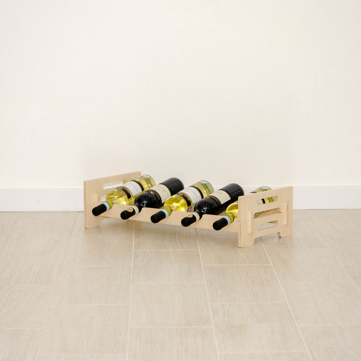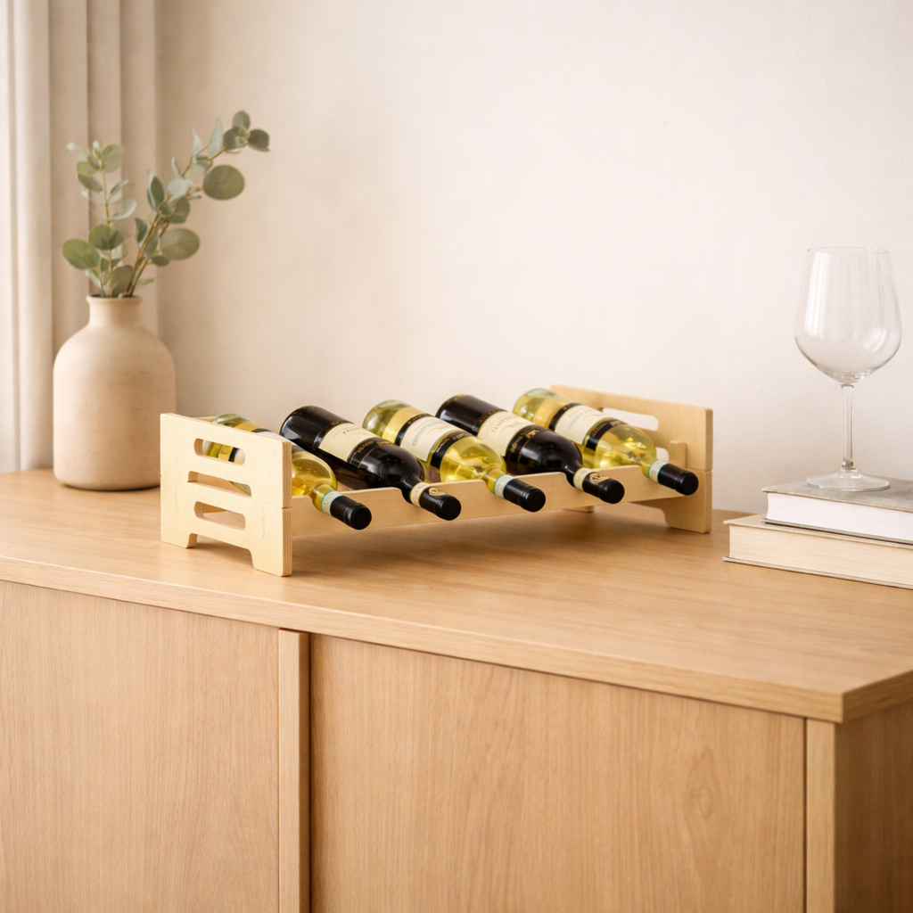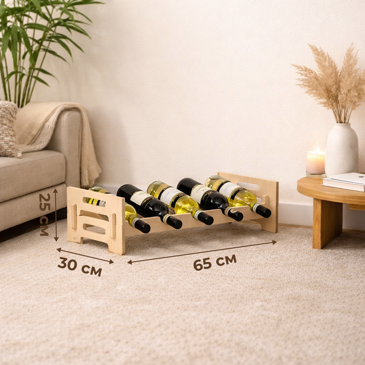 Минималистичный винный стеллаж из натурального дерева — идеальный вариант для хранения небольшого количества вина без лишней обработки и визуального шума. Стеллаж рассчитан на 5 бутылок вина и шампанского и подойдёт для тех, кто предпочитает простые и естественные решения.