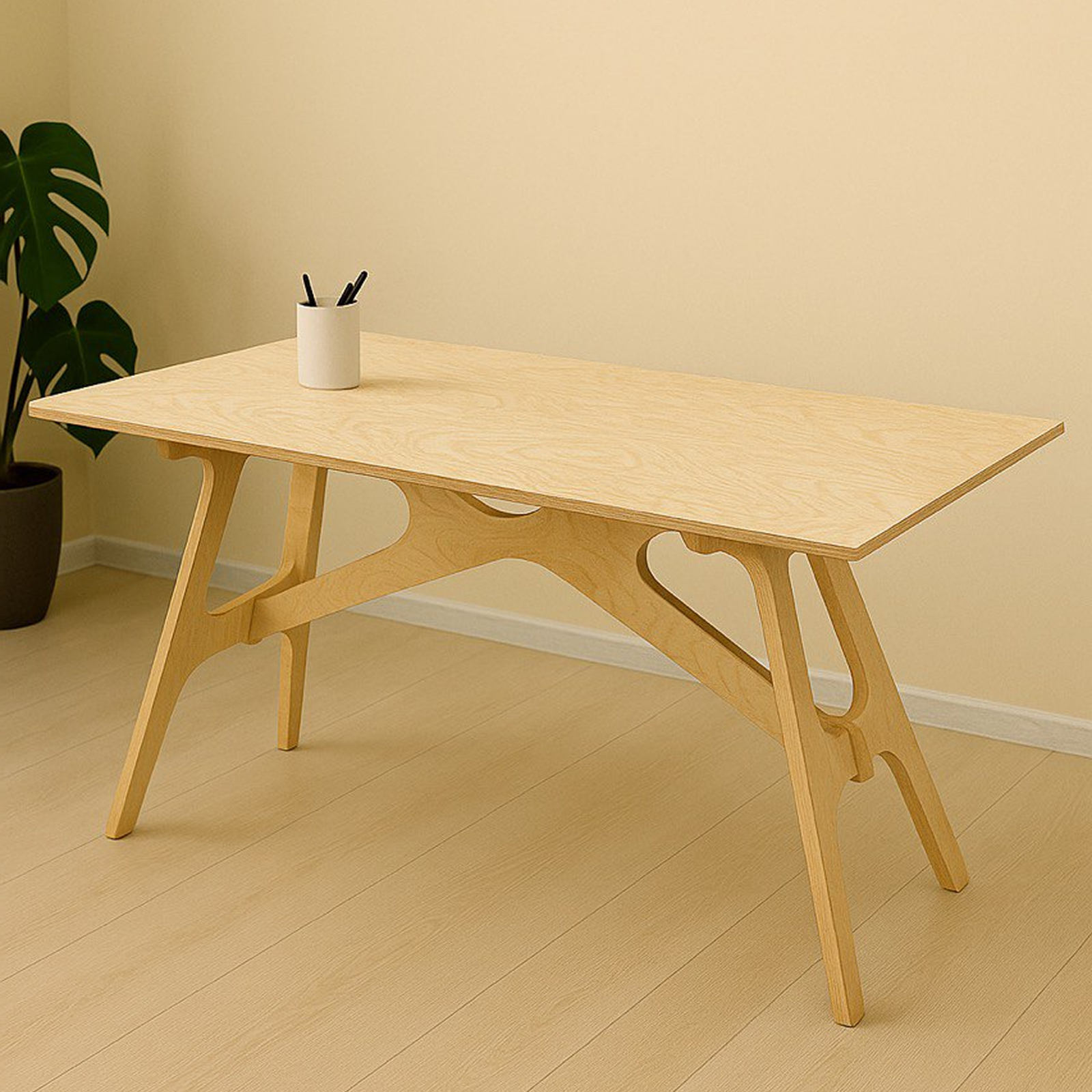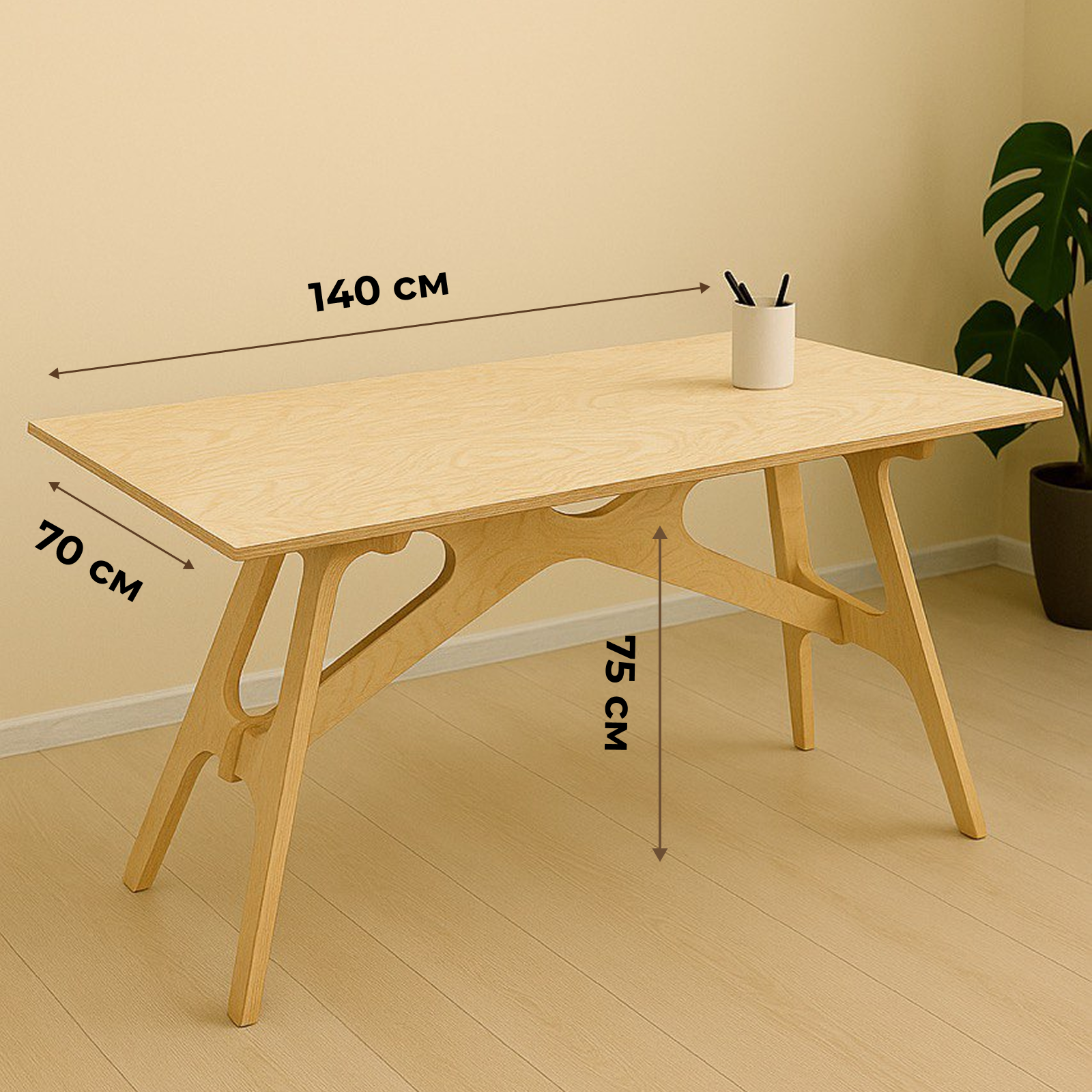 Стол из фанеры толщиной 15 мм размером 140×70×75 см с прозрачным лаком подчёркивает естественную текстуру дерева и защищает поверхность от повреждений. Минималистичный дизайн делает стол универсальным элементом мебели для дома, офиса или творческой зоны.