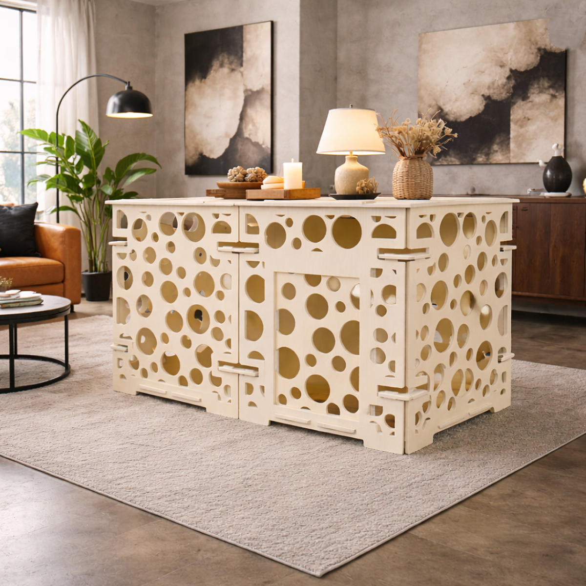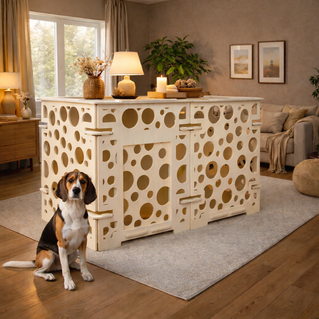 Декоративный паттерн «Круги» заменяет классические прутья, благодаря чему вольер воспринимается как элемент мебели. Он органично вписывается в интерьер и может использоваться как аккуратный домик для питомца, не нарушая общий стиль комнаты.