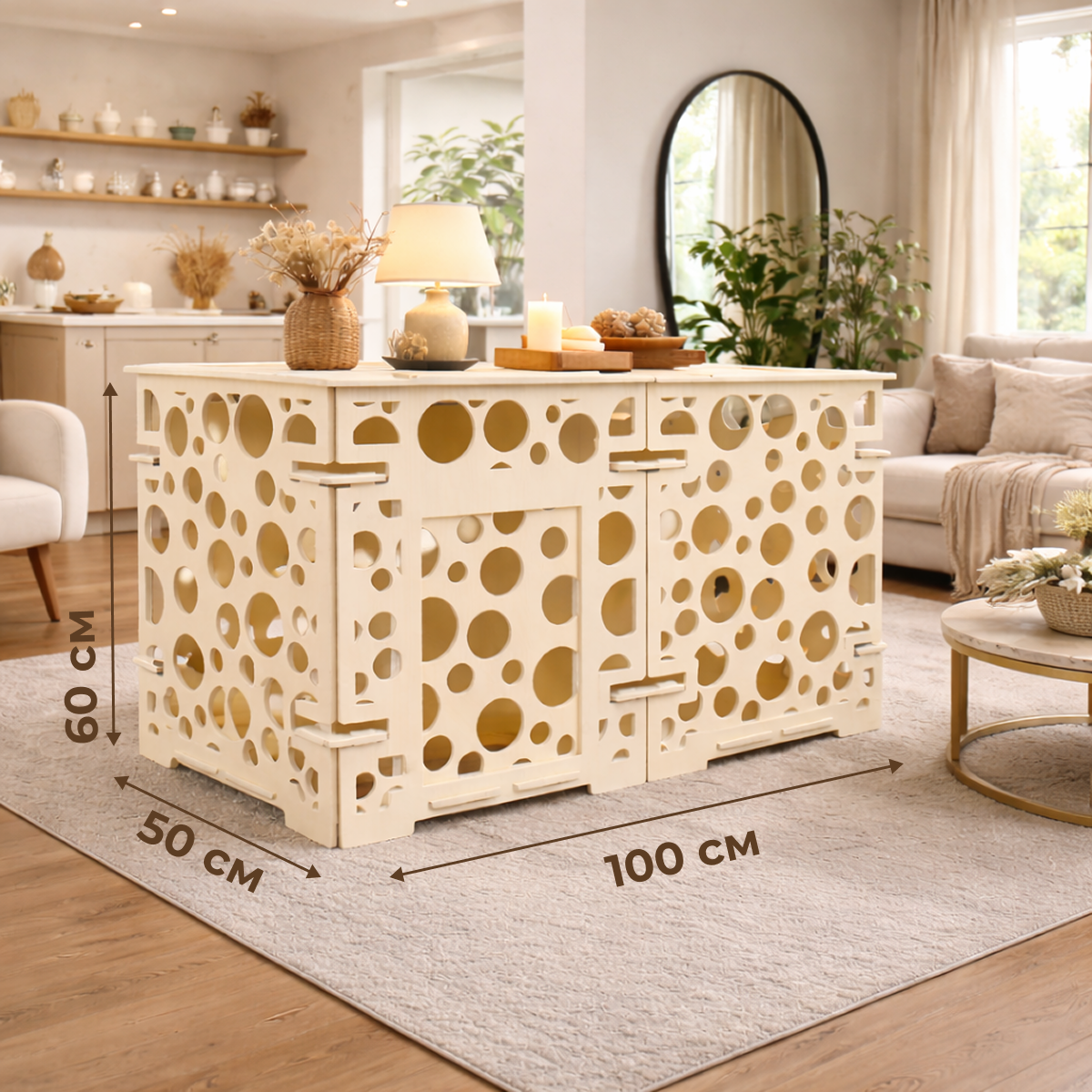 Интерьерный вольер-домик — это функциональное и эстетичное решение для создания комфортного пространства питомца в доме. Модель размером 100×50×60 см с паттерном «Круги» выглядит легко и современно, придавая интерьеру аккуратный и воздушный вид.