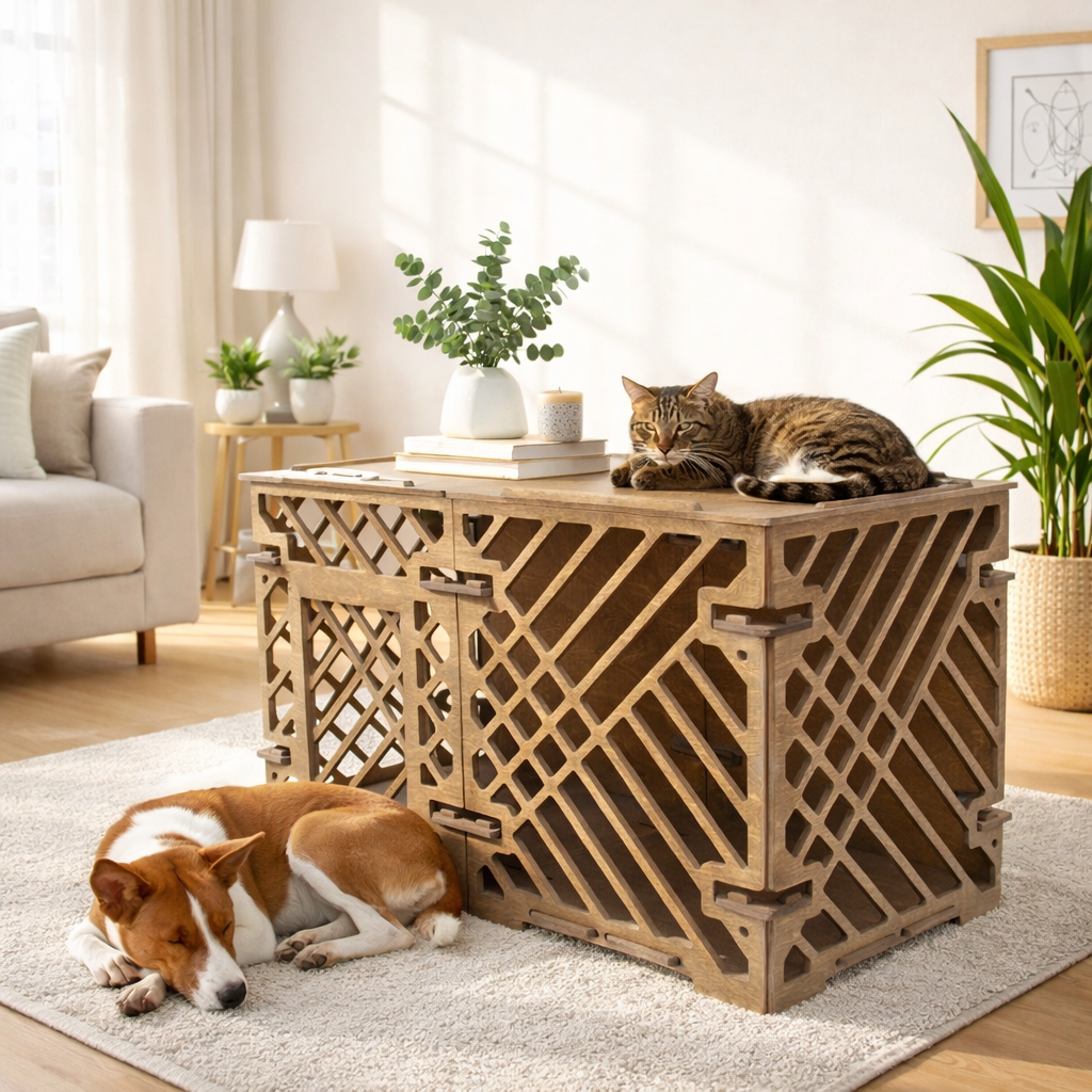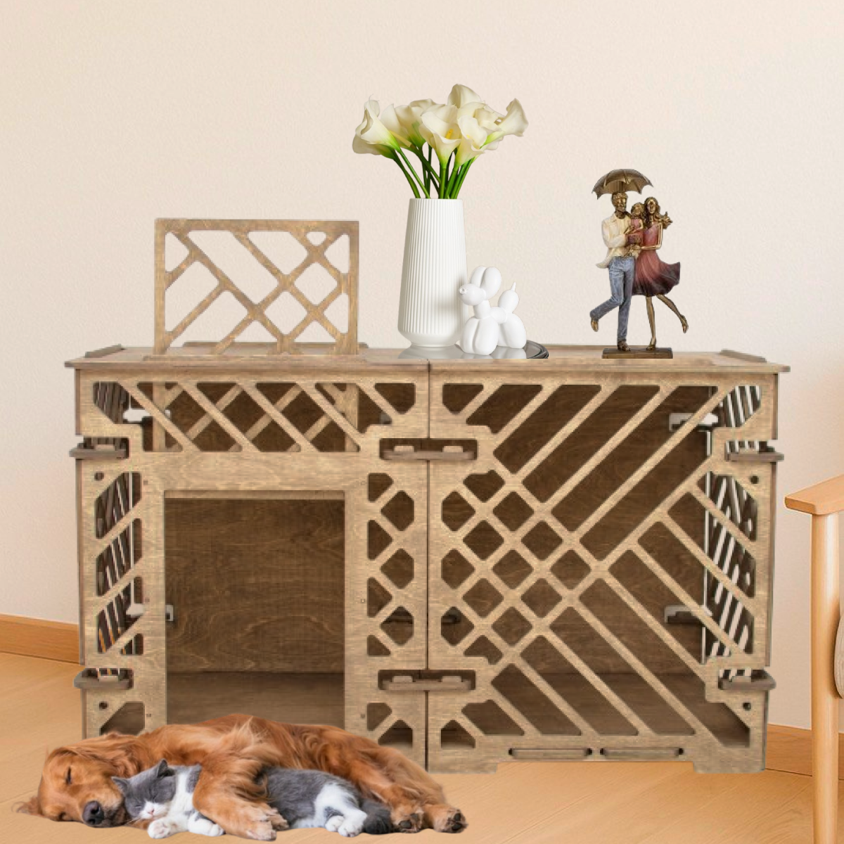 Продуманная форма и декоративные прорези создают ощущение мебели, а не зоотовара. Вольер можно использовать как место для отдыха, сна и уединения питомца, сохраняя при этом эстетику пространства.