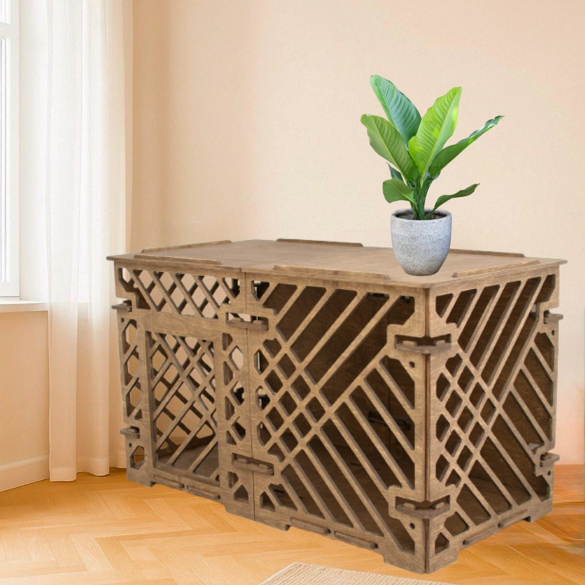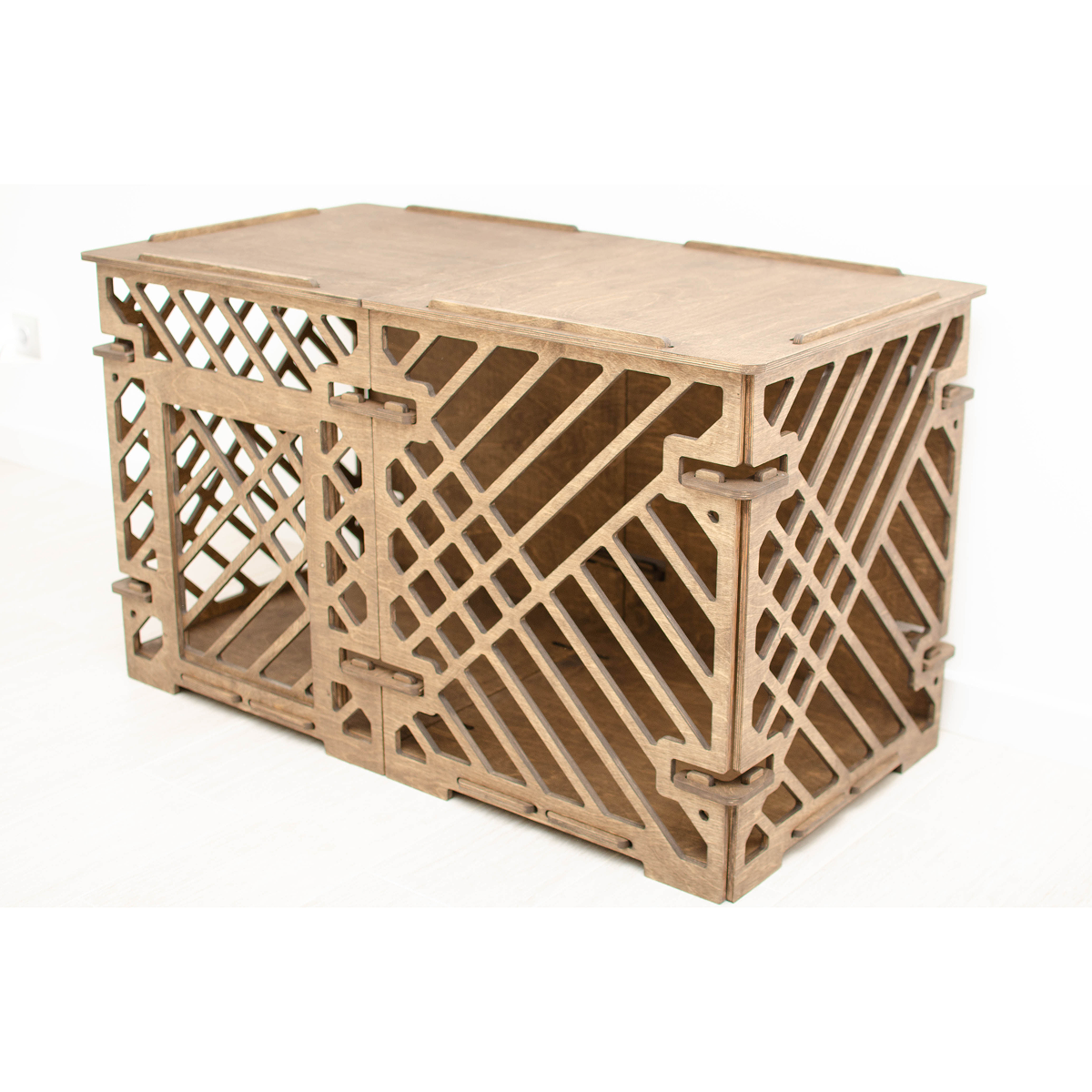 Интерьерный вольер для собак и кошек размером 100×50×60 см выполнен из фанеры и покрыт колерованным маслом в цвете шоколад. Паттерн «Линии» делает вольер визуально лёгким и позволяет использовать его как домик для питомца, гармонично вписывающийся в интерьер дома.