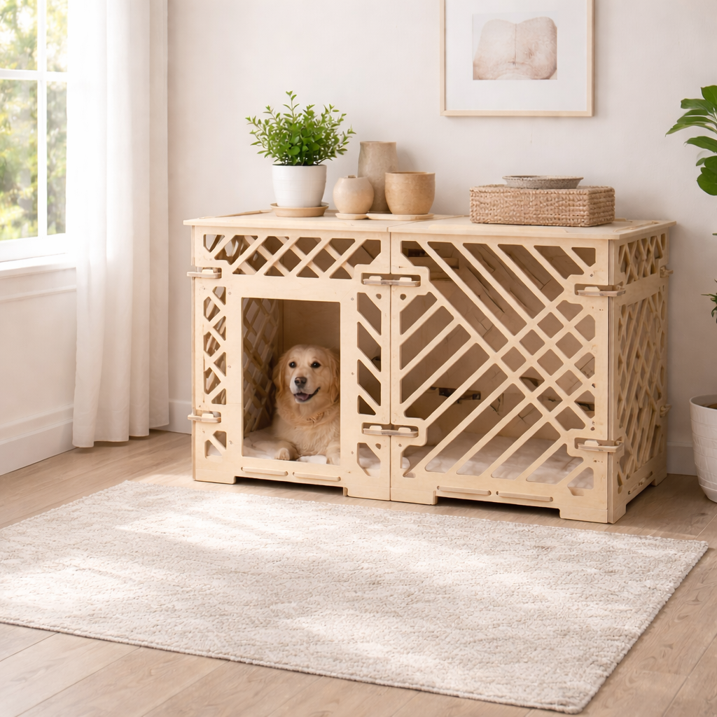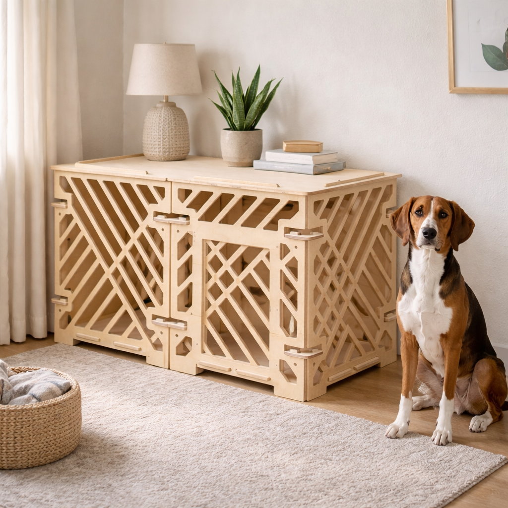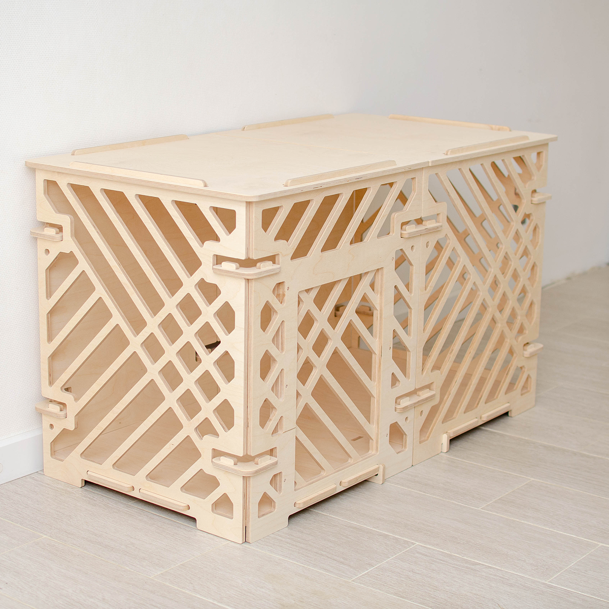 Паттерн «Линии» создаёт динамичный и аккуратный рисунок, заменяя привычные прутья и решётки. За счёт этого вольер воспринимается как предмет мебели и может использоваться не только как домик для питомца, но и как функциональный элемент интерьера.