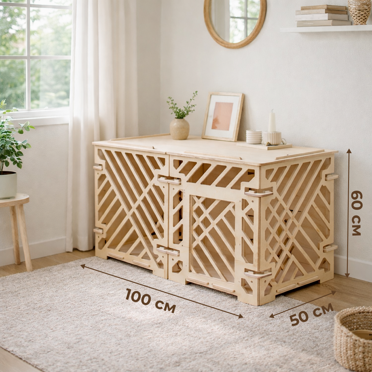 Интерьерный вольер для собак и кошек 100×50×60 см выполнен из фанеры толщиной 10 мм без покрытия. Натуральный цвет дерева и паттерн «Линии» придают конструкции современный вид, позволяя использовать вольер как удобный домик для питомца и гармоничный элемент интерьера.