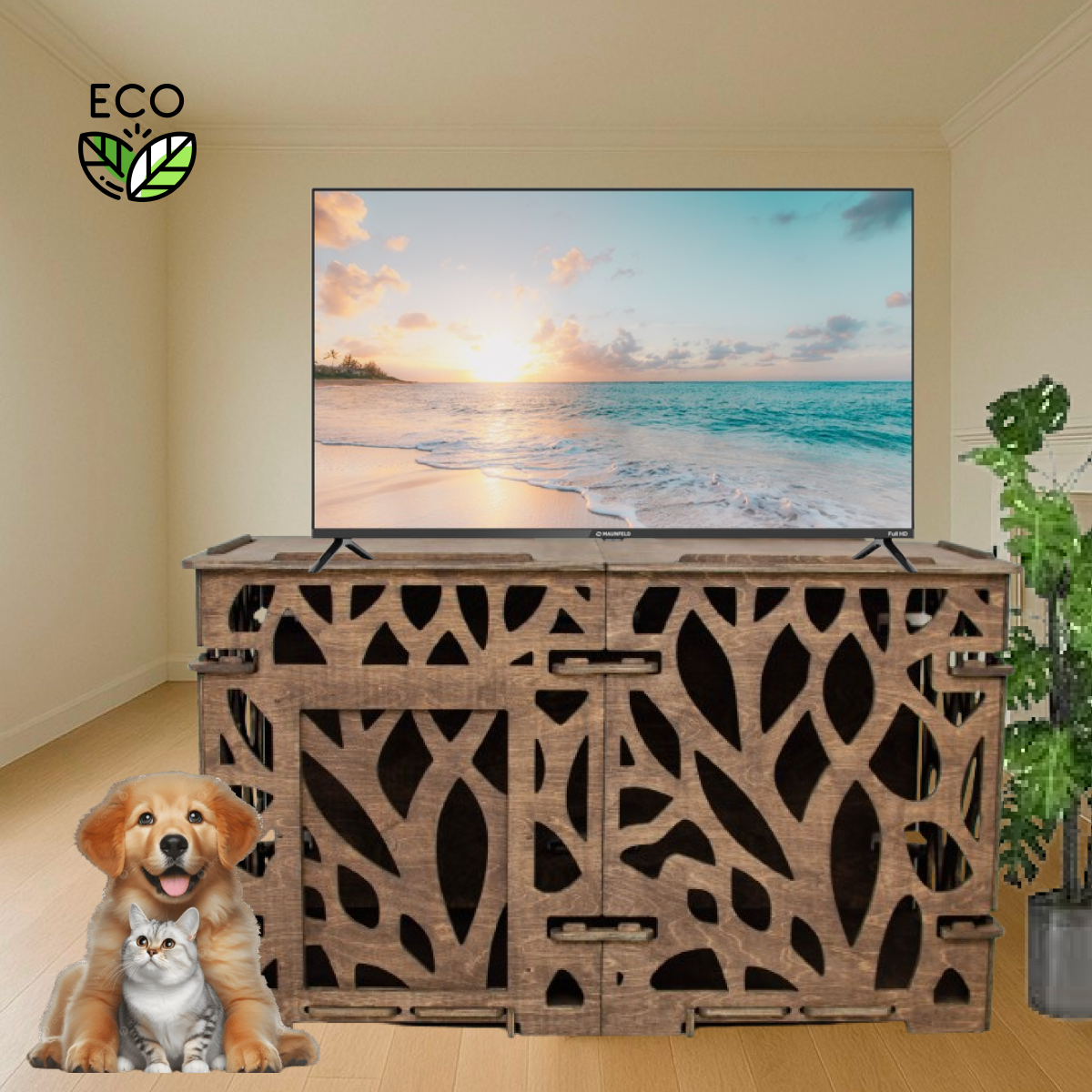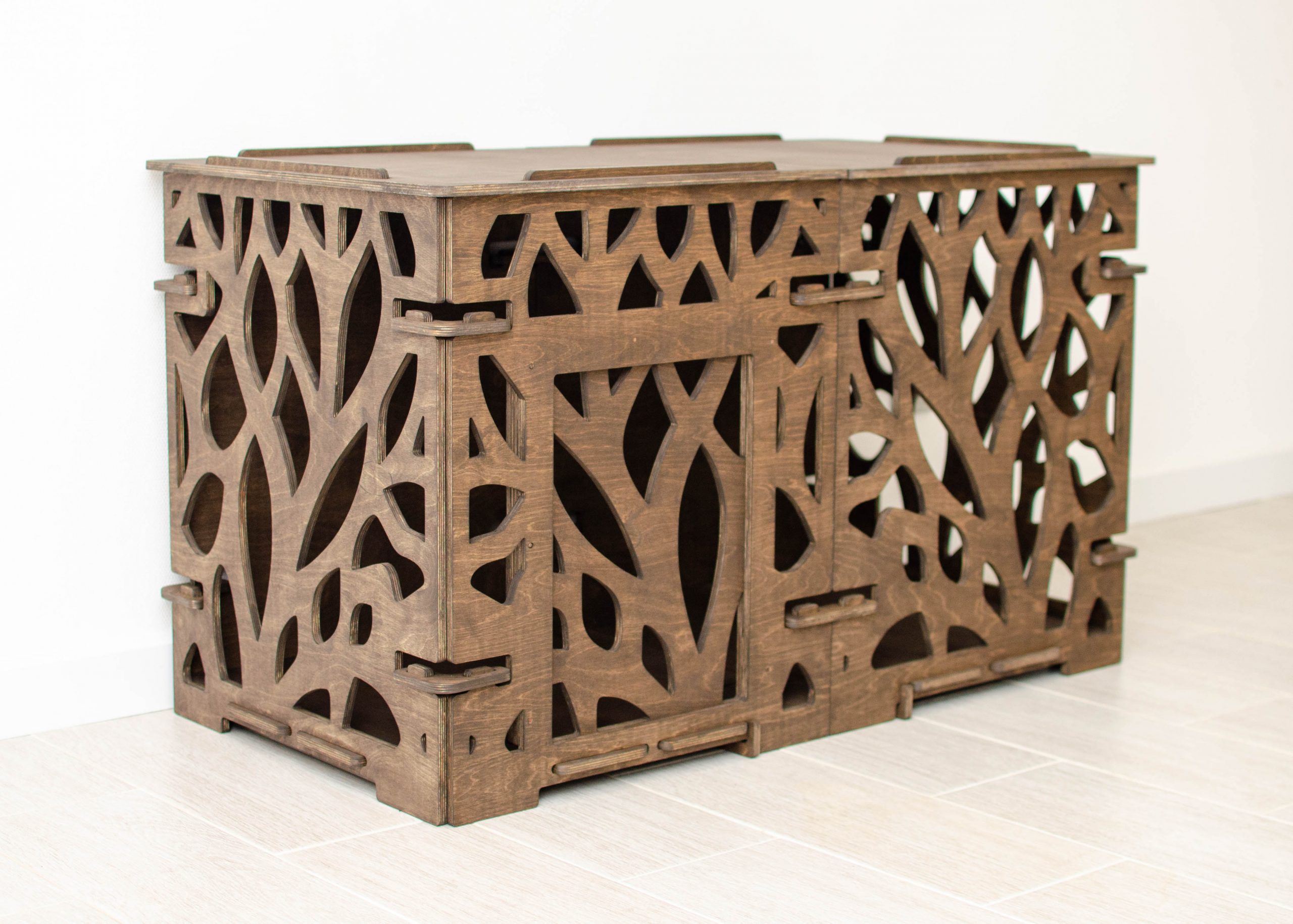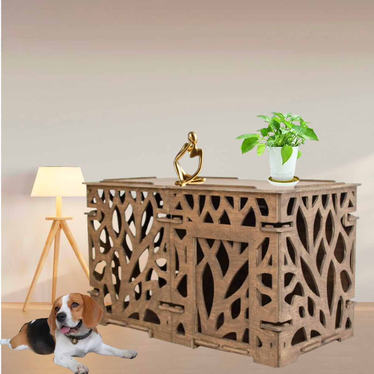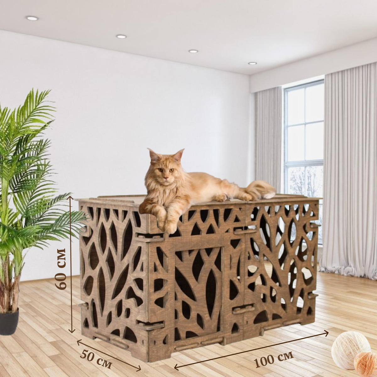 Интерьерный вольер-домик для собак и кошек размером 100×50×60 см выполнен из фанеры с покрытием колерованным маслом в цвете шоколад. Декоративный паттерн «Листья» придаёт конструкции мягкий, природный акцент и позволяет использовать вольер как полноценный элемент интерьера, а не как стандартную клетку для животных.
