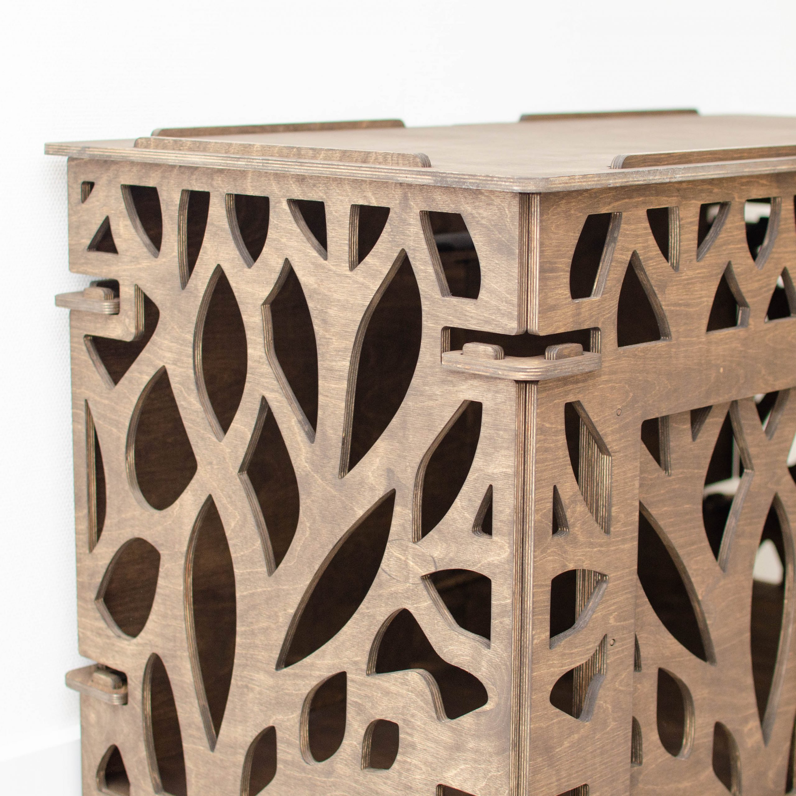 Резной паттерн «Листья» заменяет привычные решётки и прутья, благодаря чему вольер воспринимается как элемент мебели, а не как клетка. Он органично вписывается в жилое пространство и подходит для размещения в гостиной, спальне или детской.