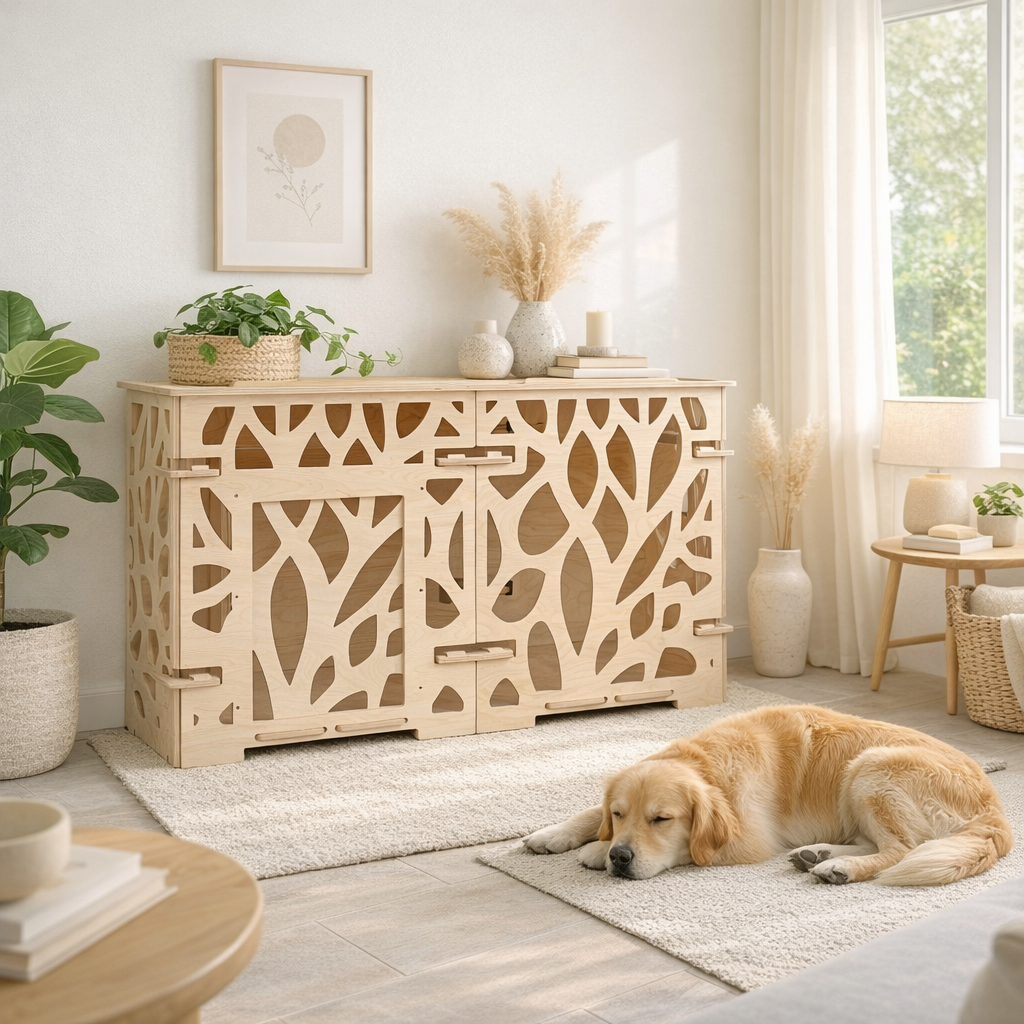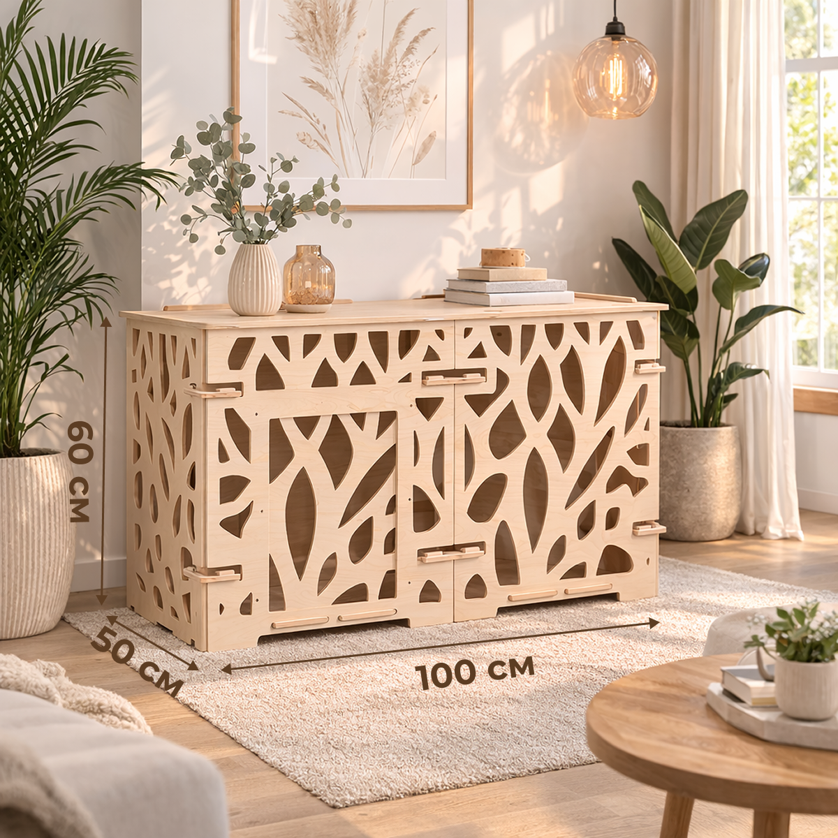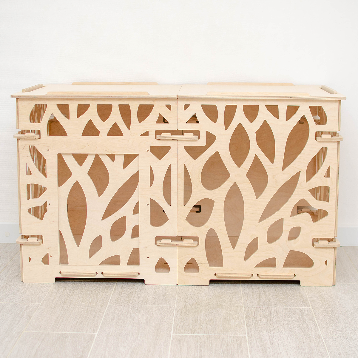 Интерьерный вольер для собак и кошек 100×50×60 см выполнен из фанеры толщиной 10 мм без покрытия. Паттерн «Листья» придаёт конструкции мягкий природный характер и позволяет использовать вольер как удобный домик для питомца и эстетичный элемент интерьера.