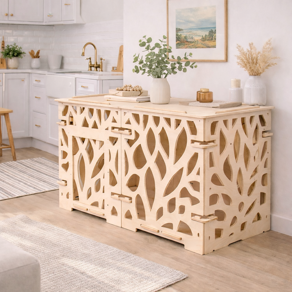 Декоративный рисунок «Листья» создаёт ощущение лёгкости и уюта, заменяя стандартные решётки. Благодаря этому вольер воспринимается как элемент мебели и органично вписывается в жилое пространство, не выбиваясь из общего стиля.