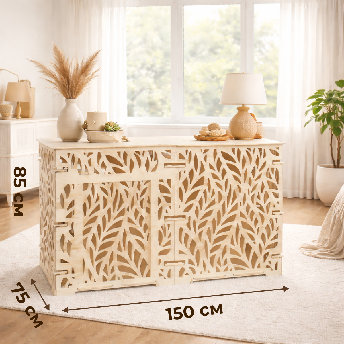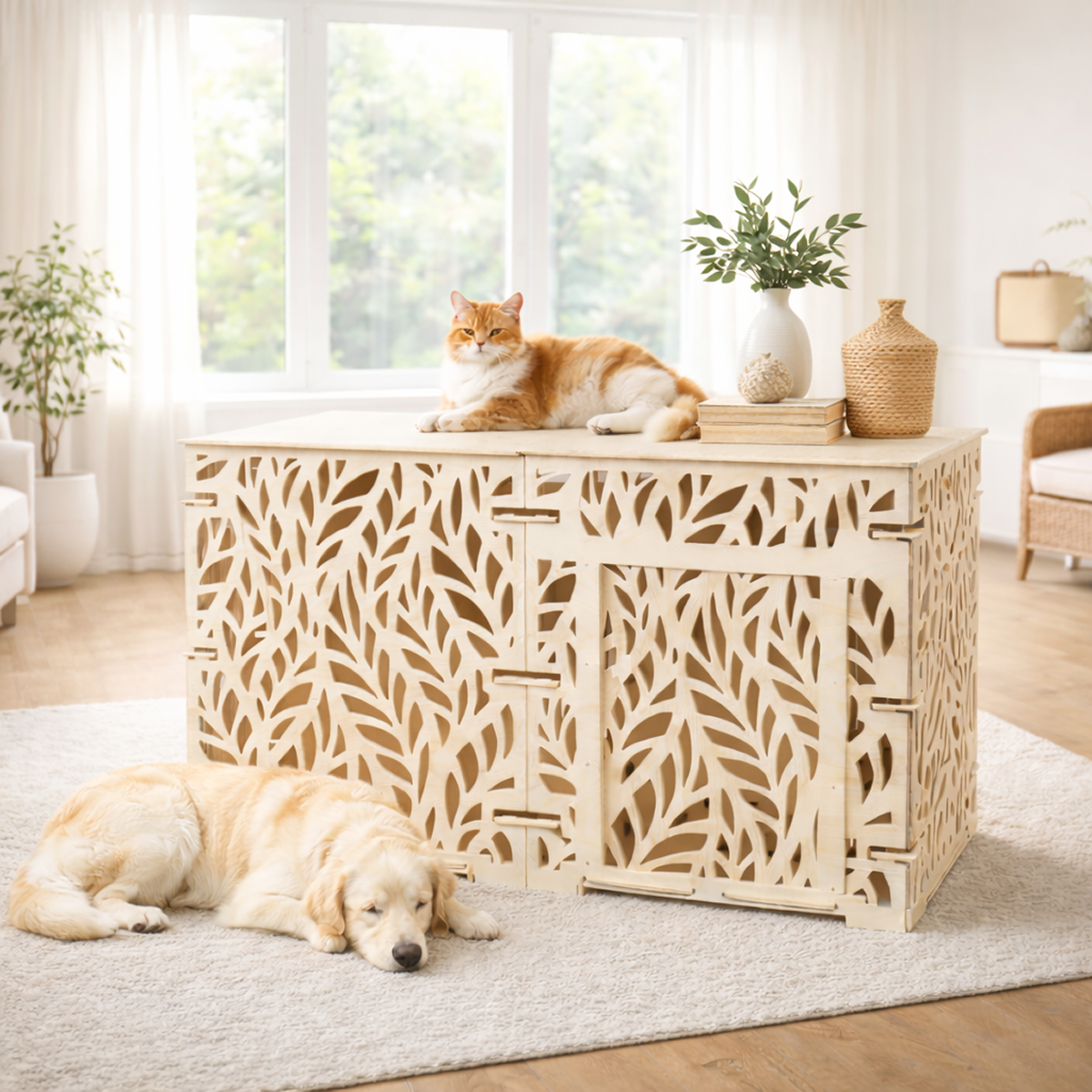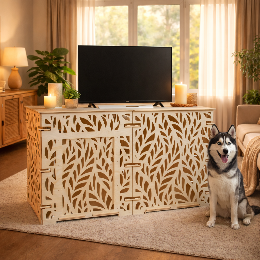 Интерьерный вольер для крупных собак размером 150×75×85 см выполнен из фанеры толщиной 10 мм. Паттерн «Мелкие листья» делает конструкцию визуально лёгкой и позволяет использовать вольер как функциональный элемент интерьера и удобное пространство для отдыха питомца.
