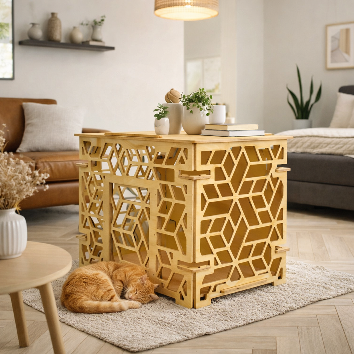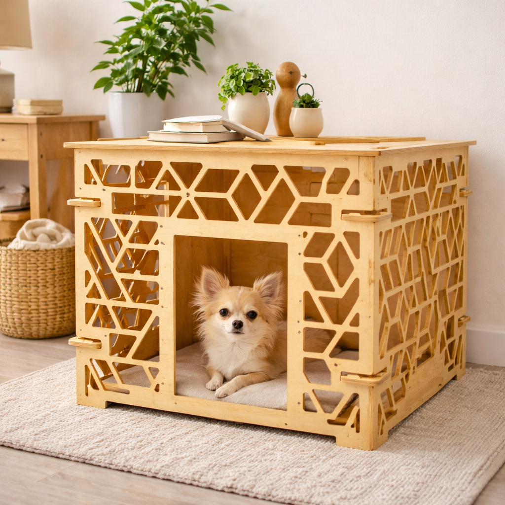 Интерьерный вольер-домик — это аккуратное решение для размещения питомца, которое не нарушает общий стиль пространства. Модель размером 70×50×60 см с паттерном «Ромбы» выглядит выразительно и современно, добавляя интерьеру чёткий геометрический акцент.