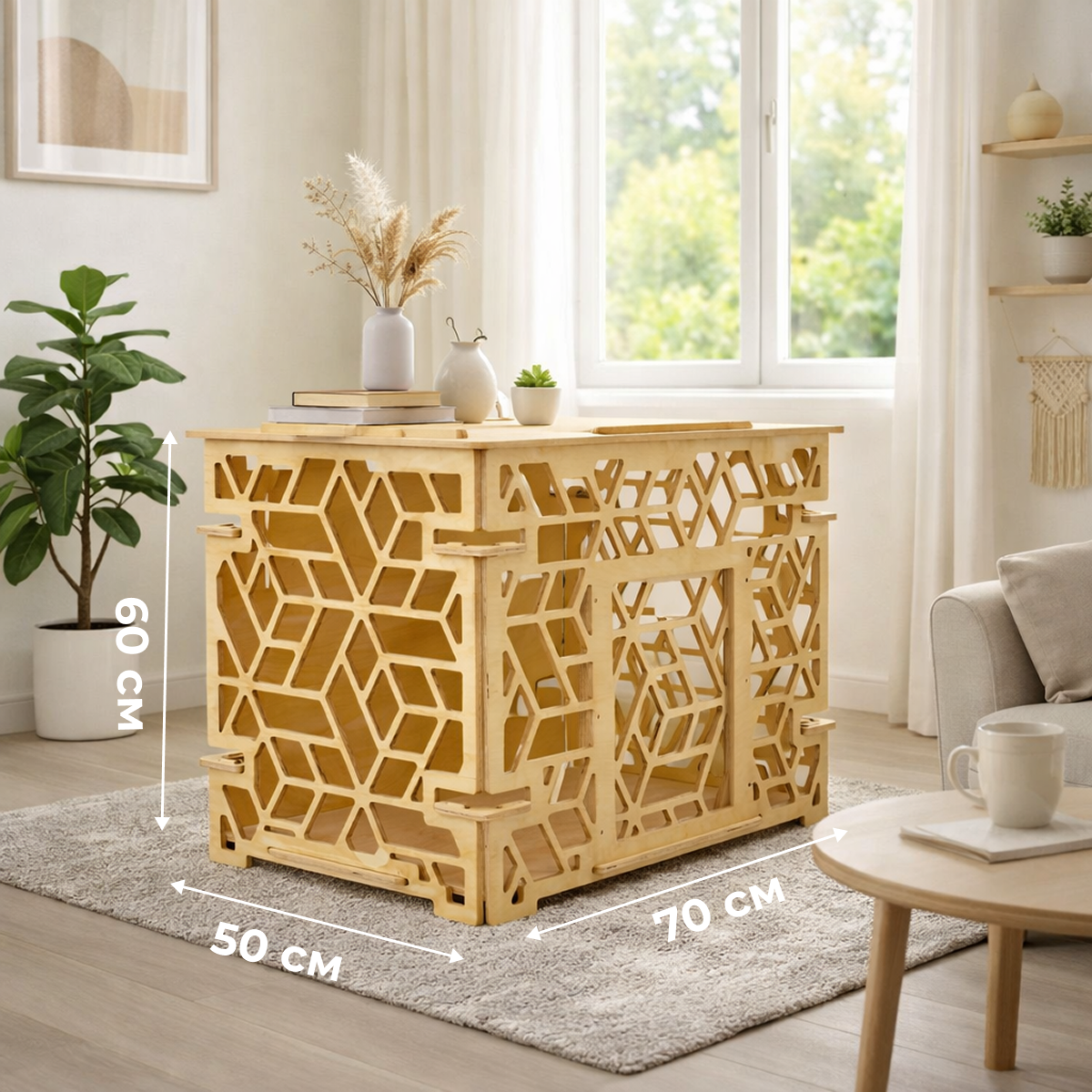 Интерьерный вольер для собак и кошек 70×50×60 см выполнен из фанеры без покрытия. Паттерн «Ромбы» создаёт современный геометрический рисунок и позволяет использовать вольер как функциональный элемент интерьера и удобное место для питомца.
